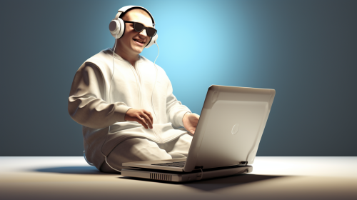 happy blind person with headphones on a laptop, handicapped, disabled, realistic, wideangle, full body, far away perspective. --ar 16:9