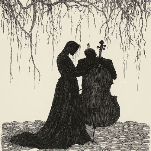 Create an eerie puppet theater scene inspired by Edward Gorey’s aesthetic. The characters should feature gaunt figures with exaggerated, elongated limbs, expressive yet melancholic eyes, and subtle wrinkles, using intricate cross-hatching to emphasize texture and depth. Capture the peculiar dynamic between the puppets and their human operators, blending surreal detachment with quiet intimacy. The puppets’ costumes should evoke an early 20th-century theatrical vibe, worn and slightly ragged. Include symbolic elements like nooses hanging from above and a gramophone resting on the table, hinting at themes of fate, nostalgia, and finality. Use a minimal background with just a hint of stage curtains, leaving most of the scene immersed in shadows. Subtle lighting should direct attention to the puppets' hauntingly blank stares, drawing viewers into a world that feels both whimsical and unsettling.