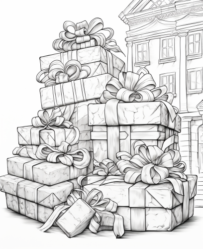 Coloring book page:: show me all the Jólasveinar as seen in island, handing out Christmas presents:: adult coloring book page thin black lines white background, 1 bit line art coloring book, only draw outlines, crisp, thick outlines, use up the entire screen, outline art, storybook illustration –-ar 3:4 –-no grayscale, noise, book, logo, page, letters, words, markers, black background