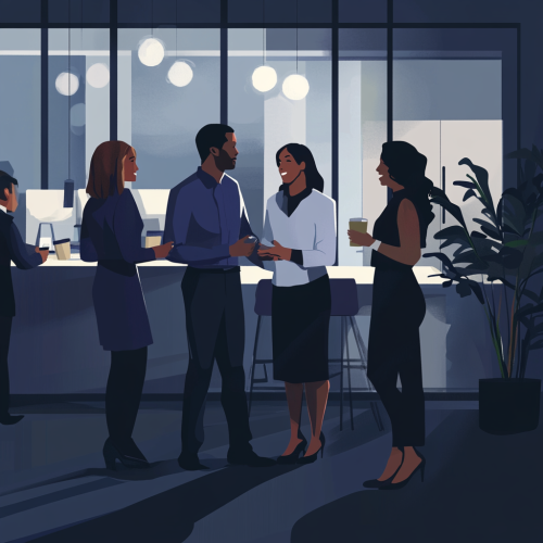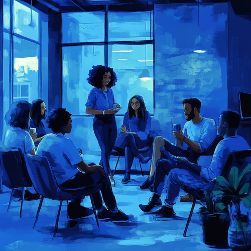 Generate a digital art for Deep navy blue background with small, minimalistic digital art elements such as computer monitors, keyboards, code snippets, and coffee mugs at the edges, in a flat lay arrangement. Use contrasting colors like white, light gray, and pastel blue for the digital art elements to ensure they stand out against the deep navy blue background. Make sure the design is minimalistic and the elements are small to avoid overshadowing the slide content. . --ar 443:960