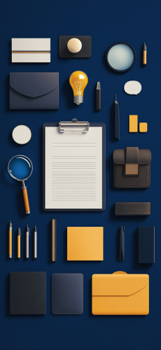 Generate a digital art for Deep blue background with small, minimalistic icons of briefcases, lightbulbs, and checkmarks in white and light grey, scattered subtly around the edges. Include faint, abstract lines in light blue to add texture without overwhelming the design. Ensure the icons are small and spaced out to maintain a clean, uncluttered look. . --ar 443:960