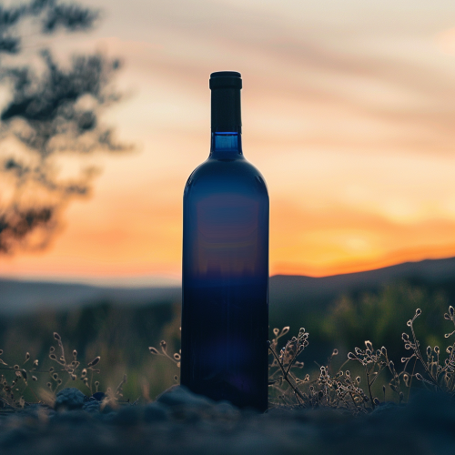 A dark blue wine bottle in a calm scene, luxury , sunset scene, minimal, advertisement, well lit