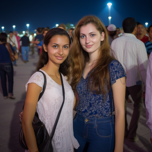 2 girls (one tall blonde, long hair, of Slavic origin and the other one shorter, shoulder length dark hair, blue eyes, of Indian origin) going to a Backstreet Boys concert in Doha Qatar