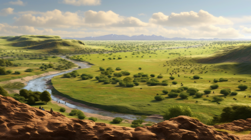 Illustrate the highland regions adjacent to the Mesopotamian plain where human civilization is believed to have originated. Content: Highland landscape, Mesopotamian plain. Medium: Digital art. Style: Historical and geographical accuracy. Lighting: Natural sunlight over the landscape. Colors: Realistic portrayal of the terrain. Composition: A detailed landscape showing the origin of civilization. --ar 16:9 --v 5.1 --style raw --s 750