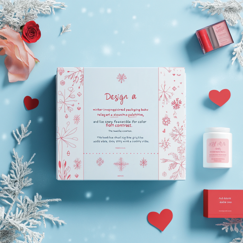 "Design a winter-inspired packaging box with a cozy, elegant feel, featuring a soft baby pink and light blue color palette, accented by touches of red for contrast. The background should be a frosty, light blue, giving a cool, wintry vibe. Add delicate snowflake and heart patterns in baby pink, scattered subtly across the design. Incorporate elegant, intricate red floral motifs or roses around the edges, adding warmth and vibrancy to the soft winter colors. The brand name should be displayed prominently in a sleek cursive font in white or light gold, with product details in red underneath. Use baby pink accents around the borders for a soft, inviting touch, with thin, embossed red lines to add refinement. The overall look should evoke a warm, festive winter atmosphere, blending the cool tones of winter with pops of vibrant red for a unique, seasonal design."