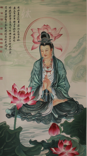 Traditional ancient Chinese landscape painting, rock color style, dreamy colors, depicting pedestrians, Buddhist temples, monks --s 50 --ar 4:3