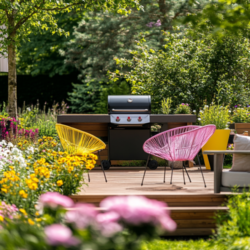A bright and inviting spring backyard scene with a kettle BBQ as the focal point, placed on a wooden deck. The BBQ is surrounded by vibrant garden plants and flowers, with a couple of pink yellow chairs nearby, creating a cozy and functional outdoor space. The BBQ and deck to stand out while maintaining a realistic, yet slightly stylized look. The overall atmosphere is warm, welcoming, and perfect for a relaxing outdoor gathering.