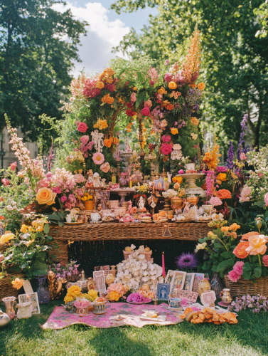 an altar made of wicker and lusicous spring flowers of pink, orange, yellow and greenery. The altar is adorned with sea shells, lace, berries, cakes, teapots and tea cups, tarot cards, colourful crystals and candles. It has a sophia coppola foes mad hatter's tea party vibe. Shot with a 90s fujifilm disposable camera. --ar 3:4 --v 6.1