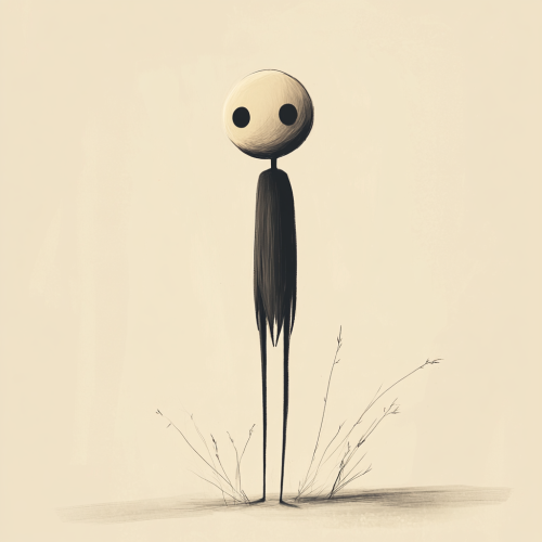 A minimalist illustration of a character with slender, slightly angular features and delicate linework. The character has a subtle expression, with a small, neutral smile and simple eyes, standing or sitting casually. Use soft but muted colors and gentle shading to create a calm and slightly melancholic mood. The background should be plain and light, with no extra details, focusing on the character's delicate lines and relaxed, understated pose.