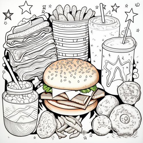 coloring page, black and white, bold clean lines, nno shading, cheeseburger and fries