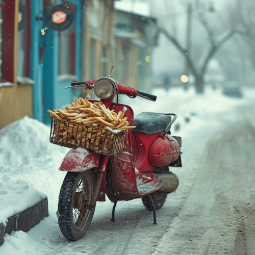 A very realistic side image of a thin, frozen galette sandwich. This sandwich contains pieces of chicken and fried potatoes with white sauce, so that part of the chicken pieces, french fries and white sauce fly over the sandwich in the air, with an artistic advertising design, so that smoke rises from it, and the white sauce appears in a way An advertisement. Next to this sandwich is a box of french fries with ketchup sauce in an advertising manner, and next to them is a can of Coca-Cola that appears in an advertising manner.