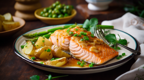 A delicious plate of baked salmon fillets glazed with a mustard and honey sauce, showing the fillets with a golden, caramelized top. The salmon is served with a side of boiled potatoes and fresh green vegetables, arranged on a clean, modern plate. The setting is a bright, inviting kitchen with a focus on the healthy, vibrant colors of the dish. --v 5.0 --ar 16:9