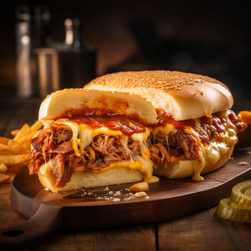 super realistic photo, 4k, showing a El Jefe Sandwich made with smoked pulled pork and a hot link topped with grilled onions, cheddar cheese, and homemade BBQ sauce, tex-mex restaurant environment, no background, sandwich served on a plate over a wood table, nice lighting, great zoom and photo quality, sandwich looking tasty and fresh.