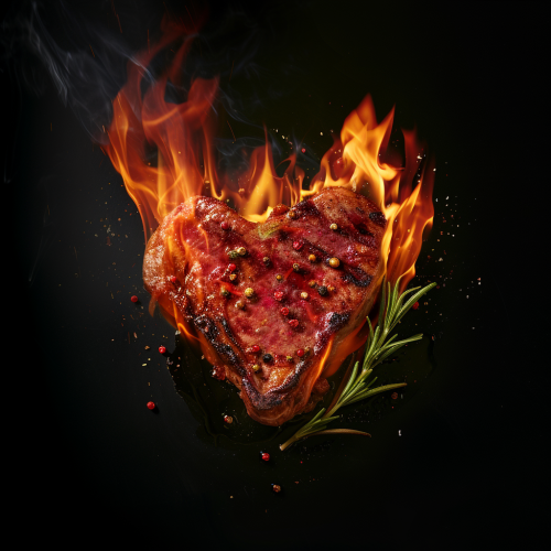 overhead photo of a heart-shaped steak engulfed in flames, with pepper and rosemarym, still life, black background, cinematic, raw, max resolution, 4k, --style raw --v 6.0
