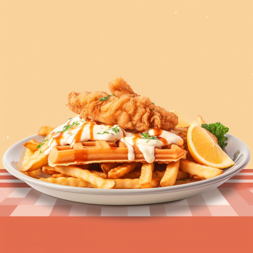 a header for a restaurant 1400x800 pixels showing fried fish and fish shrimp on top of waffles and on top of seasoned French fries