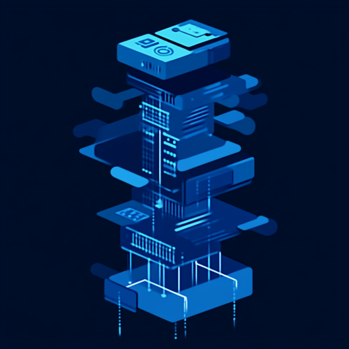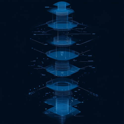 A diagrammatic portrait representation of A diagrammatic portrait of a stack data structure with various types of brackets (parentheses, square brackets, and curly braces) being pushed and popped from the stack. The background should be in dark blue color with the stack and brackets in contrasting lighter shades of blue. The image should convey the concept of matching and nesting brackets using the stack. --ar 1:1 --quality .5