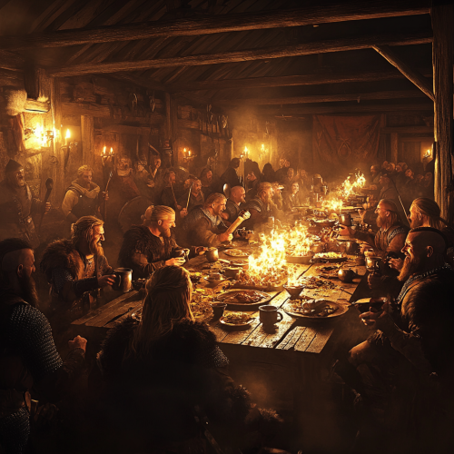 A Viking longhouse filled with warriors celebrating a feast, with roaring fires, hearty food, and the sound of laughter and clinking mugs, all under the glow of torchlight, 1:1 --v 6.1