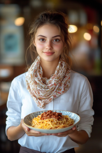 A hyperrealistic photo of a pretty young Italian waitress in a casual Italian restaurant in a white shirt and pattern scarf around her neck. Hyper realistic. Dark wood and gold interior. She is holding a colourful sicilian plate with spaghetti bolognese in it. Bokeh. --ar 2:3