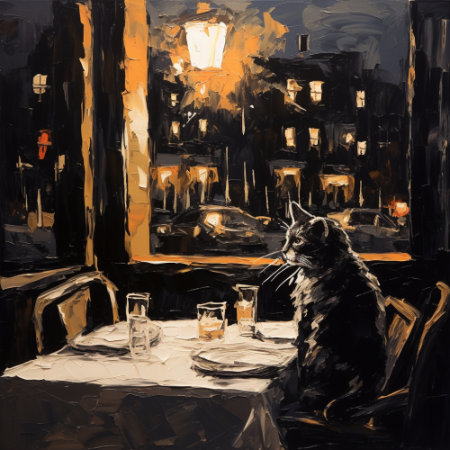 Plein air style, style of Cezanne, black and white kitty eating spaghetti dinner at a fancy Italian restaurant, nighttime moon shining through big window, candle light, Christmas decor