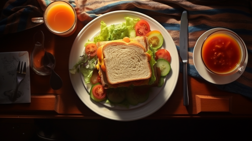 top view at the table with plate and delicious sandwich witj jam, glass of orange juice, very realistic and detailed, photo --ar 16:9