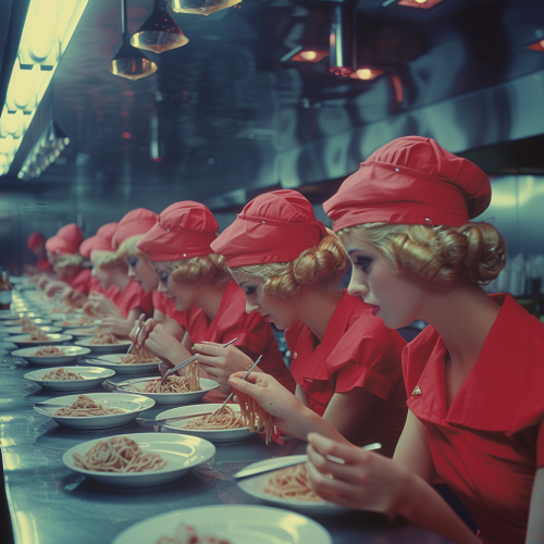 A hyperrealistic photo of a pretty young Italian waitress in a casual Italian restaurant in a white shirt and pattern scarf around her neck. Hyper realistic. Dark wood and gold interior. She is holding a plate of spaghetti bolognese. Bokeh. --ar 2:3