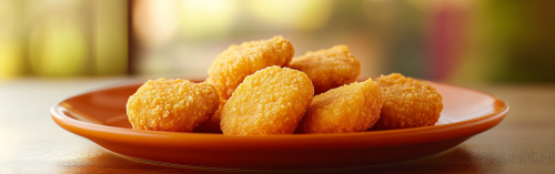 A vibrant orange plate holds a generous serving of mcdonalds chicken nuggets, some slightly irregular in shape, with a sleek texture. The background is softly blurred, creating a warm and inviting atmosphere. --ar 19:6 --v 6.1