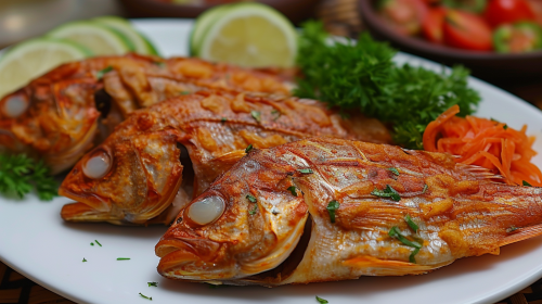 the three fried fried fish are on a white plate, hard-edged --ar 16:9 --v 6.0 --s 250
