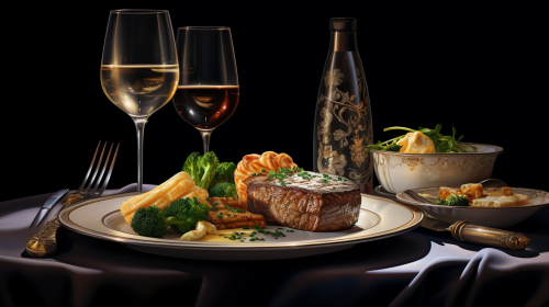 modern haute cousine expensive fance menu, medium rare steak, caviar, vegetables, potato espuma, glass of white sparkling wine, hyper realistic, epic, long shadow, intricate, regal, 30:20 realism, detailed, chiaroscuro, illustration --ar 16:9