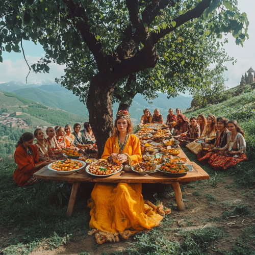 a shaman woman looking like me sitting under a fig tree with a wooden table filled with georgian feast dishes and people sitting around the table celebrating in an old Tbilisi setting