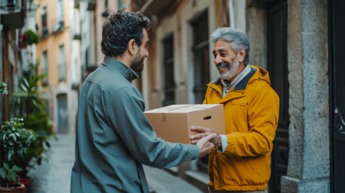 a courier delivery guy is pressing the droorbel button as he stands with a brown box package to deliver to your front door. He is facing the camera. hyper realistic. bright sunny daylight. ultra realistic photo quality