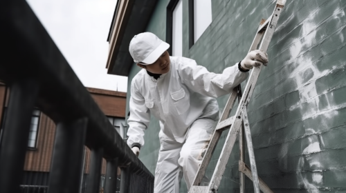 realistic photo of fully body shot, A handsome Japanese man wearing a stylish work uniform and a white helmet climbs a ladder and is painting an exterior wall with a roller in his hand --v 5.0 --ar 16:9