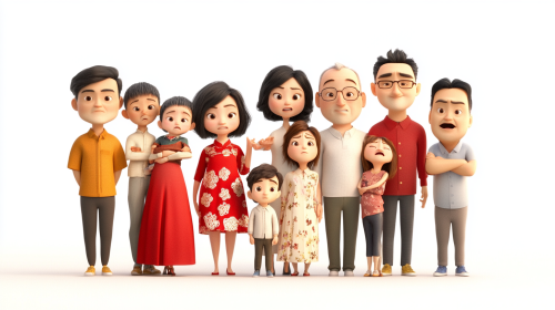 a cute avatar of a chinese family and a malaysian family standing together. they are all grieving, extremely angry, and demanding answers. solid white background. style of pixar 3d.