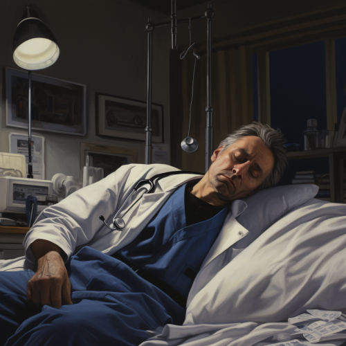 exhausted resident physician fast asleep on a bed with his pager at his side. Looking exhausted with his mouth open and snoring.