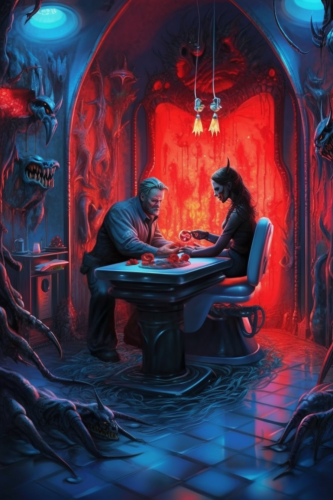 detailed realistic illustration sticker, scene takes place in a demonic massage studio in hell filled with crystals and bottles of essential oils and flames and dripping red wax and lost souls, a giant evil demon is giving a lady a deep tissue massage on a massage table --v 5.1 --ar 2:3