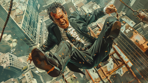 A highly detailed digital painting of a real estate agent in a suit, his foot caught in a metal bear trap. His expression shows pain and frustration as he tries to pull free. The background is a dark forest, symbolizing isolation. Created Using: realistic textures, sharp lighting contrasts, dramatic shading, natural realism, hd quality --ar 16:9 --v 6.0