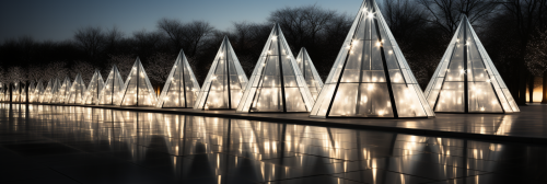 shopping mall decorated for Christmas. Geometric. Row of high end Christmas trees expertly decorated with white lights. Black and white with vibrant color splash. Shot with a Pentax. K-3 III Monochrome. Very stylish. Beautiful. Elegant. High-end. Award winning display. --ar 3:1 --q 0.5 --s 750