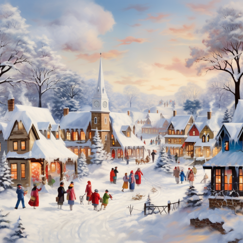 christmas morning village scene with people, snow blowing in the snow, in the style of precise, detailed architecture paintings, snow scenes --ar 1:1 --style raw --v 5.2