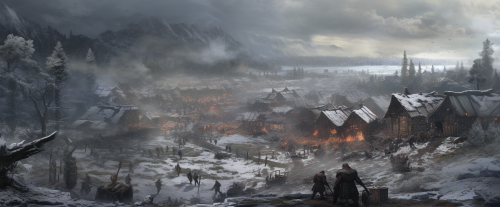 a vintage oil painting of a gingerbread house village in the snow --ar 16:9 --style raw