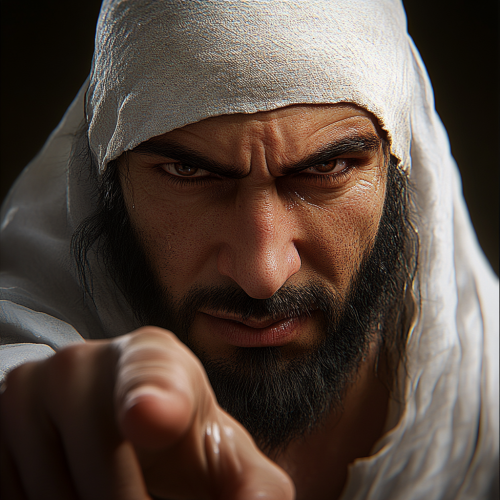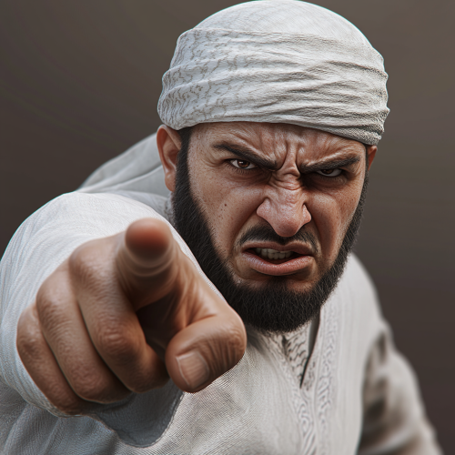 A photorealistic image of an Arab Maghrebian man in his thirties with brown hair and a beard, wearing a white 'khamis' (traditional long tunic for men) and a white Muslim cap. The man is slightly overweight and appears angry, with furrowed brows and a sly, SNEACKY smile. He is pointing his finger toward the camera as if accusing someone. His face is sweating, adding intensity to the scene. The image should have a detailed and realistic facial expression. The photo is taken with a Sony Alpha 7IV.