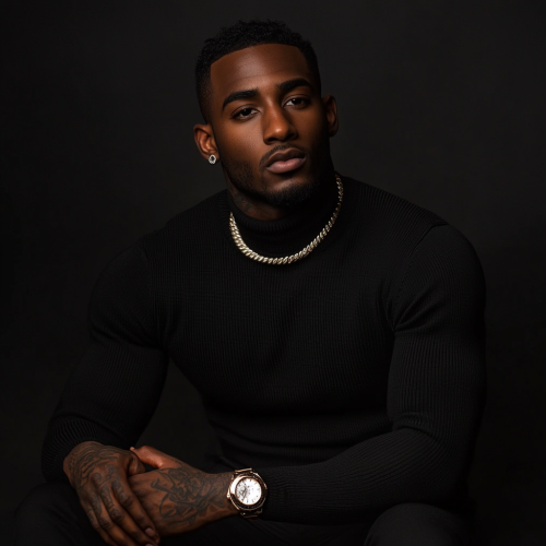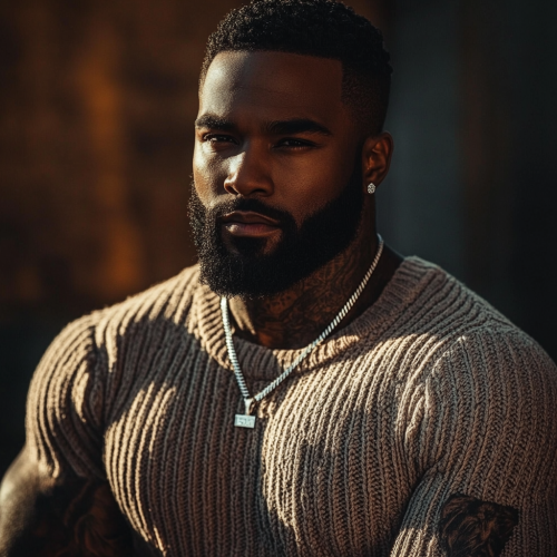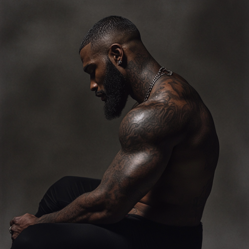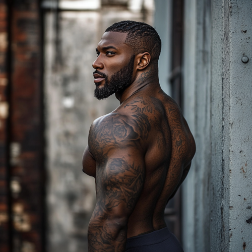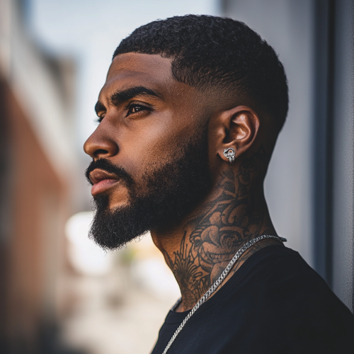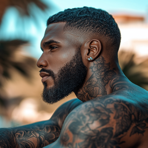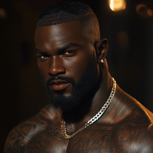A black DARK Skinned man. He is TALL with close cut, fine silky hair and a full beard. His edge up is sharp and perfect! The lighting highlights his muscular physique. He is handsome with detailed tattoos and a Cuban chain.