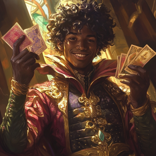 a portrait of a dark-skinned man dressed in court jester attire, curly hair, a deck of magical cards cascading between his hands, a mischievous grin on his face. dnd character