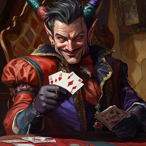 a portrait of a devious man dressed in court jester attire, a deck of magical cards cascading between his hands, a mischievous grin on his face. dnd character