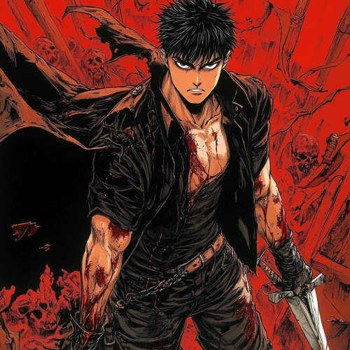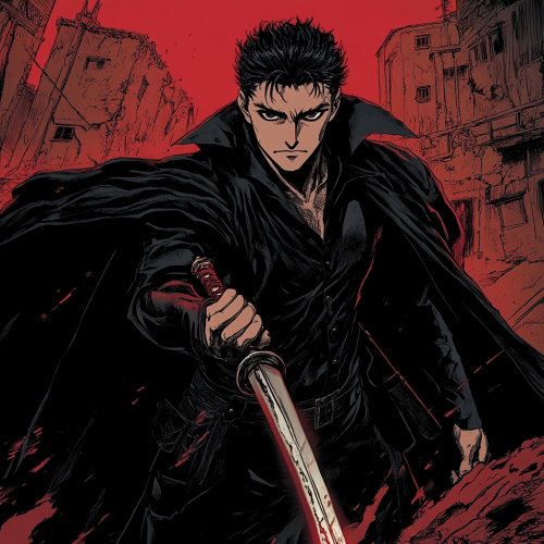 Um caçador de vampiros estilo mangá japonês, berserk style, ele tem cabelos curtos e pretos, ele tem olhos vermelhos, um sorriso de canto de boa sínico, usa um sobretudo preto com botas e calça de couro preta, camisa preta, ele é um vampiro, ele tem uma espada demoníaca prateada larga em suas mãos, ele está em um vilarejo pegando fogo, com vários vampiros rodeando em sua volta, arte estilo mangá, arte estilo manhwa, desenho,
