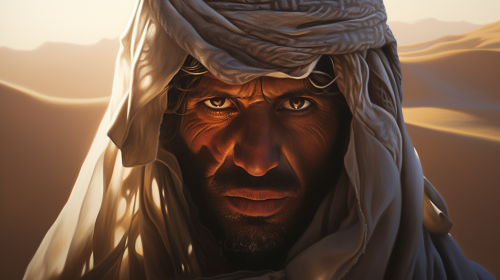 an angry arab with light emanating from his face in the desert hyper realist 16k resolution --ar 16:9 --s 50