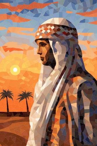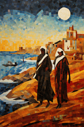 Marsa Matruh, folk art style, illustration, Mosaic art, arab Bedouin people, sea, desert, history, space for text --ar 2:3 --v 5.2