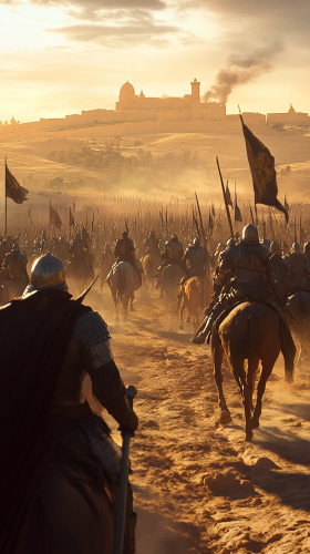 Saladin’s grand army, with banners fluttering in the wind, advances toward Jerusalem. Thousands of soldiers in intricate medieval armor are moving through a sunlit desert, with the city’s walls looming in the distance. Surreal, hyper-realistic, Ultra HD --ar 9:16