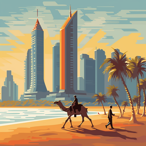 Desert scene with camels:: big city in the background:: use only square pixels --style raw --stylize 1000 --weird 1000