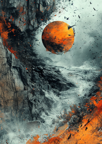 Within a moment, destiny. Quiescent image with Unpleasantness, a Abstract style, and a Wide-angle view --v 6.0 --c 15 --ar 25:35 --s 750