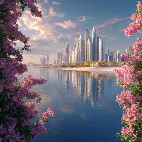 What Abu Dhabi looks like, fascinating, 2024s, imaginative, realistic, photographic of the city of Abu Dhabi, background Abu Dhabi city view and desert view, incredible, creative, sea 3d render, city lights, nowadays a day, night, half moon, star, summer spring flowers