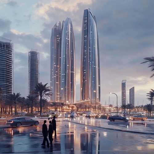 What Abu Dhabi looks like, fascinating, 2024s, imaginative, realistic, photographic of the city of Abu Dhabi, background Abu Dhabi city view and desert view, incredible, creative, traffic in the city square 3d render, city lights, beautiful and handsome Arabic people walking, luxury cars, skyscraper, winter